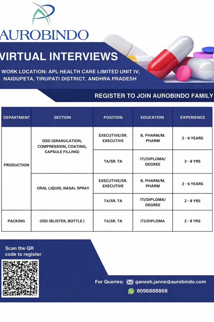 Aurobindo Pharma is conducting virtual interviews for experienced professionals in Production and Packing departments at APL Health Care Limited – Unit IV, located in Naidupeta, Tirupati District, Andhra Pradesh.